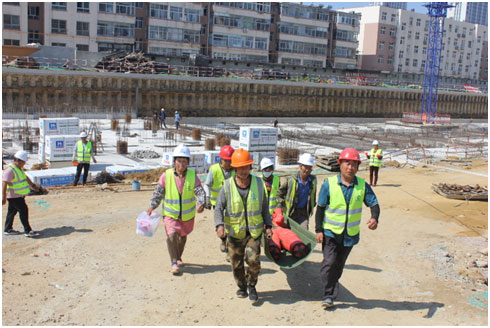 本次演練模擬為施工現場材料堆場出現火情和坍塌,施工人員發現后立即向項目經理報告,項目經理根據現場情況立即啟動應急預案。項目部全員按照應急預案進行疏散逃生。醫療救護組、安保組、綜合協調組等迅速集結,在做了緊急部署后,搶救傷員、滅火行動組同步行動,整個演練井然有序進行。